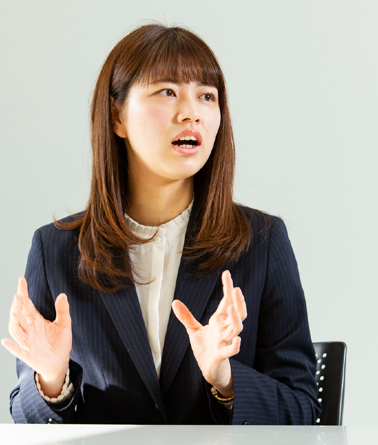 岡田:遠藤さんは管理職になったばかりでしたね。チームをまとめるのは大変でしょう。 遠藤:海外での経験も活かし、仲間が100%のパフォーマンスを発揮できるよう心がけています。遠慮なく相談してもらえるよう、役職の壁、世代の壁を作らない関係づくりを大切にしています。 伊豆倉:私の場合、取引先の訪問もありますが、オフィスで海外とやり取りすることが多いので、商材の翻訳などの勉強も大変です。案件のサポートをとおして、チームの一員だと実感できる場も多く、とてもやりがいを感じています。